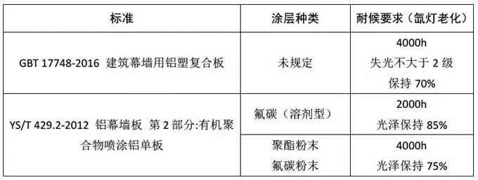 由于以上標準對于鋁板和鋁塑板用幕墻產品的涂層做了直接的規定,要求其耐候性必須達到較高的要求。在鋁板幕墻標準中直接規定了涂層的種類,而鋁塑板幕墻標準中雖然未規定涂層種類,但是其4000h的耐候要求根本是其他涂層無法企及的,氟碳涂層幾乎成為其為數不多的選擇。