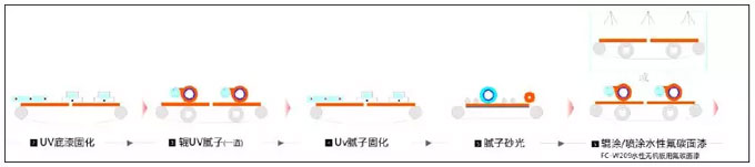 水泥纖維板----------UV滲透------UV填補前處理后------水性氟碳涂料涂裝-----烘烤------包裝。涂裝工藝一,主要是針對目前的無機板前處理工藝和設備現狀, 只對涂層的面漆涂裝進行來更換, 可以方便快速的油性改水性, 但不是很徹底, 畢竟底漆為油性的UV底漆。
